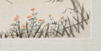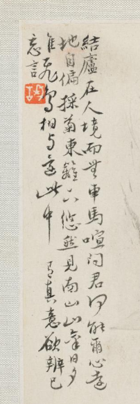 本品规格为11.2 x 13.1 厘米。绘一老者,着素袍、戴斗笠,持杖徐行,神态悠然;衣纹简淡,传递 “采菊东篱下” 的闲适,呼应题诗 “采菊东篱下,悠然见南山” 意境。以枯树、荒草、小花勾勒山居环境,色调清寒(淡墨染树,朱红点菊 ),营造 “结庐在人境,而无车马喧” 的宁静,暗合陶渊明 “归隐” 主题。左侧题陶渊明《饮酒・其五》诗句,借诗明志;红印 “子” 点缀,强化 “诗画互证” 的文人画传统,体现清代 “以诗入画” 的创作风尚。