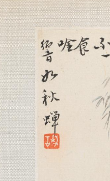 本品规格为11.2 x 13.1 厘米。绘一人裹被,眠于石龛(山石围合,如天然洞窟 ),身旁溪流蜿蜒,上方垂竹遮阴,营造 “与世隔绝” 的隐修环境;用笔简率(人物的蜷缩、山石的皴擦 ),显 “逸笔草草” 之趣。上方题诗 “石龛丈室寒,隐被破蒙头。眠于孤独下,食一唯秋蝉”,以 “寒、破、孤、秋蝉” 强化清苦、孤寂的隐者形象;红印 “子” 点缀,呼应 “诗画一体” 的文人传统。