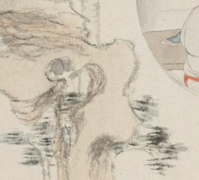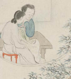 本品规格为11.2 x 13.1 厘米。绘二仕女,一着白衣、一着蓝衣,相偎于桐阴下的圆桌旁,姿态亲昵(似共读、低语 ),传递 “闺中雅集” 氛围,呼应清代文人对 “林下风致” 的推崇。 以桐树(枝叶浓淡相间,营造 “桐阴蔽日” 感 )、湖石(皴擦见秀,添文人气 )、修竹(淡墨点簇,显清幽 )勾勒庭院小景,借 “洞门” 框景,强化 “咫尺庭院,深闺藏秀” 的意境。