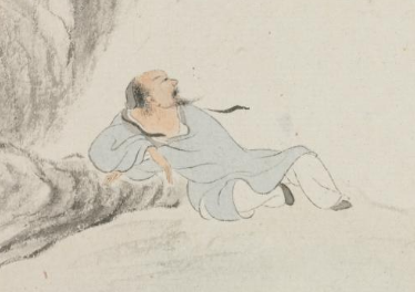 本品规格为11.2 x 13.1 厘米。画中绘一位身着淡蓝色长袍的男子,姿态放松地卧于岩石旁。他一手撑着头部,神态悠然,似在享受这片刻的宁静, 传递出一种超脱尘世的闲适感。画面左侧有嶙峋的岩石,用笔简洁地勾勒出岩石的轮廓与纹理,表现出岩石的质感。上方老树斜出,枝干弯曲, 以淡墨绘就,寥寥几笔便勾勒出树枝的形态,枝头还有稀疏的细枝,虽未着墨太多,却尽显老树的苍劲古朴。 整幅画构图简洁,留有大片空白,给人以空旷、静谧之感。