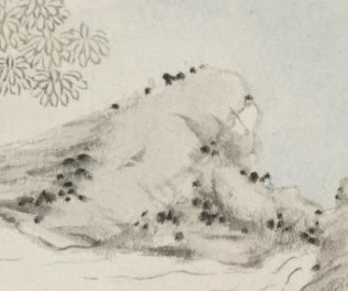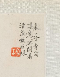 本品规格为11.2 x 13.1 厘米。绘一人着白衣,独坐溪边,面向溪流与远山;近景有古树(枝叶繁茂,一深绿、一浅粉,体现季节层次 )、坡石,中景溪流蜿蜒,远景淡墨染山,营造 “咫尺山林,多方胜景” 的意境。 借 “幽溪独坐” 场景,传递清代文人对 “静、远、逸” 的追求 —— 远离尘嚣,与山水对话,在自然中寻诗思,是儒家 “修身” 与道家 “无为” 思想的融合。