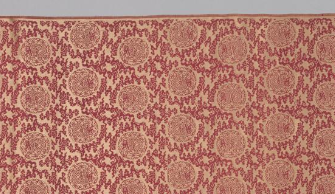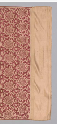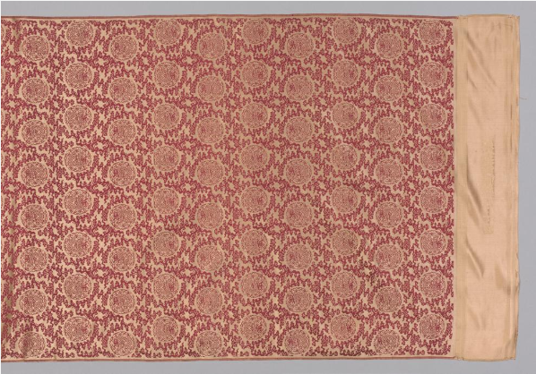 本品规格为。锦缎以红色作为底色,色泽沉稳而艳丽,富有庄重之感。其上的团花纹饰则采用相对浅淡的色调,与红色底形成鲜明对比 ,凸显出花纹的精致。红与浅色调的搭配和谐,既彰显出热烈的氛围,又不失典雅。团花纹饰规整有序地分布于锦缎之上,每个团花造型饱满,内部纹样细腻丰富,可能包含花卉、云纹等传统吉祥图案 ,寓意美好。团花的轮廓线条流畅,边缘装饰精致,展现出清代丝织品在图案设计上对细节的极致追求。这些团花均匀排列,形成一种富有韵律的视觉效果, 整体给人以繁复华美、秩序井然的美感。