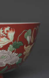 本品规格为直径6.5厘米,高度14.7厘米。碗体为经典的撇口、弧腹、圈足形制,线条流畅优美,比例协调。瓷胎细腻坚致,历经岁月仍显温润,体现清代制瓷对胎质的严格把控,为整体美观与实用性奠定基础 。以浓郁红釉为地,鲜艳夺目。五彩花卉纹为饰,蓝、粉、绿等色彩搭配和谐,绘有牡丹等花卉,花朵形态饱满、层次丰富,叶片脉络清晰,笔触细腻。红地与五彩花卉相互映衬,既显热烈富贵,又具清雅细腻的审美,契合清代对吉祥花卉纹饰的喜爱 。
