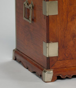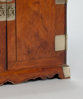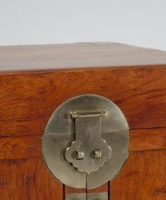本品规格为40.7 x 41.3 x 35.6 厘米。尽显古典雅致之美。以优质黄花梨为材,木质温润,纹理细腻且富有自然美感,如行云流水般的纹理,诉说着岁月沉淀。箱体呈规整方形,沉稳大气。铜件镶嵌是其亮点,边角处铜质包角,加固且添金属光泽,与木质温润形成对比。正面圆形铜锁扣,造型古朴,搭配对称小铜饰件,兼具实用与装饰性,彰显工艺精巧。