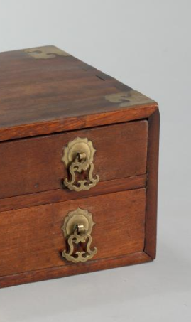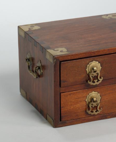 本品规格为16.1 x 50.2 x 24.2 厘米。以珍贵黄花梨为材,木质温润,纹理细腻,自然美观。箱体呈修长形,线条简洁流畅。铜件镶嵌精巧,边角处铜质包角与装饰,既加固又添金属光泽,与木质形成质感对比。双屉设计实用,抽屉面配精致铜拉手、锁具,兼具功能性与装饰性,工艺精湛。整体将黄花梨天然美与铜饰工艺融合,是清代兼具实用与艺术价值的储物精品,承载当时工艺水准与审美 。