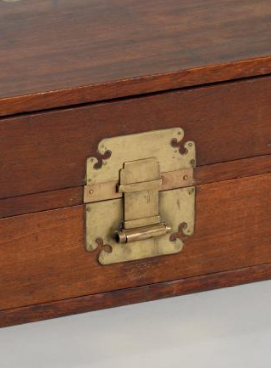 清代时,对于文人雅士来说,它是收纳文房四宝及相关器物的理想之选。上层抽屉可以放置精致的毛笔、名贵的墨锭、小型印章 ,下层抽屉则能收纳宣纸、书画册页、砚台等。这些物品不仅价值不菲,还需要妥善保存,黄花梨的材质和长箱良好的密封性可以有效防止物品受潮、受损 ,铜锁扣还能保障物品的安全性。