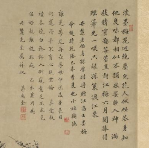 在清代,文人雅士对诗画艺术有着极高的追求。这幅图轴将墨笔梅花的绘画与诗文相结合,挂于书房、客厅等场所,供主人和宾客赏玩。人们可以细细品味画家笔下梅花的神韵,感受书法之美,研读诗文的内涵,从中获得审美愉悦和精神享受。