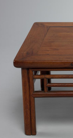 本品规格为28.6 x 50.8 厘米。整体造型古朴典雅,尽显中式家具韵味。桌面采用攒边装板工艺,边框规整,芯板纹理自然流畅,展现木材天然之美,且有效防止板面变形。桌体低矮,腿部线条简洁,腿间设棂格纹横枨,既加固结构,又添装饰性,体现清代家具实用与审美融合的特点,是研究清代家具工艺与生活文化的实物范例 。