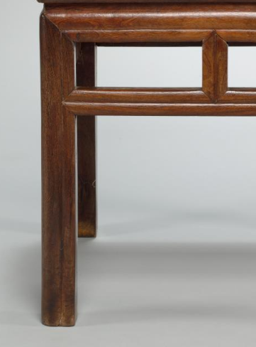 本品规格为48.3 x 48.3 x 48.3 厘米。采用攒边装板工艺,四周以边框攒边,中间嵌入板面。这种工艺不仅能有效防止板面变形,还增添了层次感和精致感。板面纹理清晰,色泽温润,彰显出木材的天然之美。凳面下方设有束腰,束腰部分虽窄,却起到了划分上下结构的作用,增加了视觉上的节奏感。束腰之下连接牙板,牙板与凳腿的结合处过渡自然,展现出精湛的榫卯工艺。四条腿足笔直挺拔,线条简洁流畅,展现出稳固的支撑性。腿足之间设有枨子,起到加固的作用。枨子之间还带有简洁的棂格纹装饰,在增强结构稳定性的同时,又为方凳增添了几分雅致。