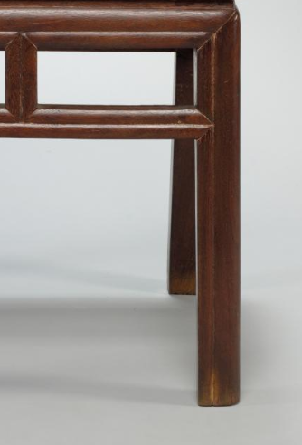本品规格为48.3 x 48.3 x 48.3 厘米。采用攒边装板工艺,凳面边框与芯板拼接严整,既稳固又具美感,是传统木工技艺的体现。直足设计简约,四条腿足笔直利落,与凳面、牙板等部件通过榫卯相连,结构坚实,传承古人精湛工艺。整体方正端庄,线条简洁流畅,无过多繁杂装饰,契合清代家具追求质朴、实用的审美倾向,又因工艺细节彰显精致,呈现出简洁而不失典雅的格调,是清代民间或文人家具的典型代表,承载着时代的生活与审美记忆 。