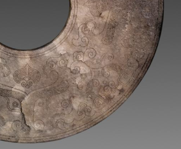 本品直径11.4 厘米。呈现出标准的圆形玉璧造型,中间有一个圆形穿孔 ,符合传统玉璧 “肉倍好谓之璧”(“肉” 指边,“好” 指孔,即边宽为孔径的两倍 )的形制规范,整体轮廓规整。玉璧表面雕刻有丰富多样的纹饰,以线条流畅的卷云纹、如意纹等为主 ,这些纹饰相互交织,或环绕在玉璧边缘,或点缀于璧面各处,布局错落有致,雕刻细腻,展现出清代玉器雕刻工艺的精湛 。此外,部分区域还雕刻有一些造型独特的图案,像是变形的兽面纹等,给人一种神秘的美感。