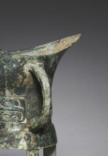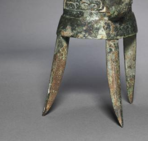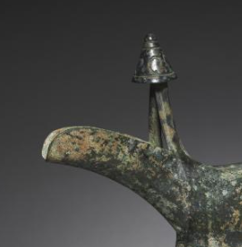 本品规格为32.4 x 24.2 厘米。青铜爵整体造型舒展且富有张力。其前部有流口,倾斜上扬,方便倒酒;后部尖锐的尾与流口相呼应,使器物在视觉上保持平衡 。口沿上立有一对菌状柱,这是青铜爵的标志性特征之一, 可能在饮酒时起到滤网作用,或具有一定的象征意义。一侧设有弧形鋬,便于握持;底部由三根尖状高足支撑,使器物呈现出挺拔之势。