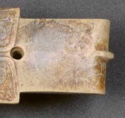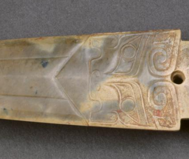 本品规格为4.4厘米。 长条形,前端为尖锐援部(似利刃 ),后端设阑(凸起棱线 )与内(安装柄部的部分 ),内上有穿(圆形孔,用于捆缚固定 ),符合商代玉戈 “援 - 阑 - 内” 的经典结构,是权力与礼仪的象征(非实战兵器,属礼器 )。 青玉质地,受沁呈斑驳色(灰、褐沁斑 ),表面打磨光滑;援部起脊线,阑部雕刻兽面纹(简化的眼睛、鼻梁,用阴刻线勾勒 ),线条刚劲,体现商代 “以纹为尊” 的玉器装饰风格,虽简约却威严庄重。