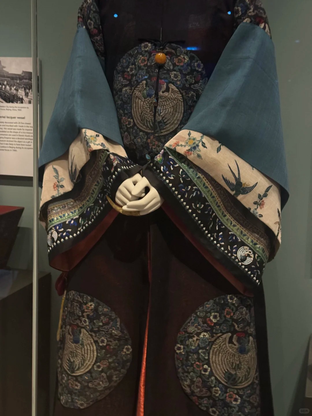 清代是中国最后一个封建王朝,在服饰制度上有着严格且完备的体系。清代女性服饰尤其是贵族女性服饰,不仅注重实用性,更是身份、地位以及文化审美 的体现。当时的丝织业和刺绣工艺达到了很高的水平,能制作出如此工艺精湛、装饰华美的服饰,反映了清代手工业的发达以及对服饰艺术的极致追求。而这件服饰也成为了清代服饰文化乃至整个清代社会文化的一个缩影,承载着当时的工艺技术、审美取向等诸多历史信息。