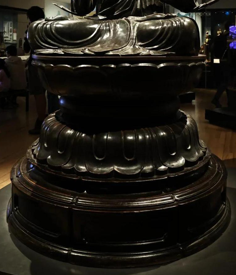 材质与色泽:主体为铜质,表面呈现出古朴的黑褐色,可能是因年代久远氧化所致,展现出历经岁月的沧桑感。莲台部分雕刻精美,虽同样是铜质,但因表面处理和光线反射等原因,与佛像主体在色泽上略有差异。