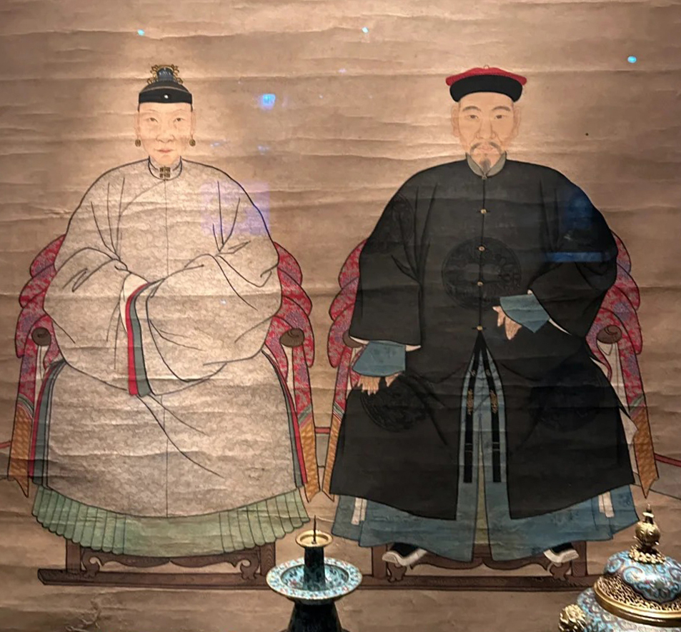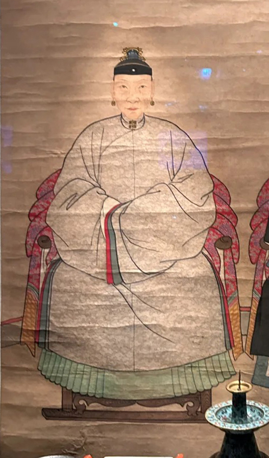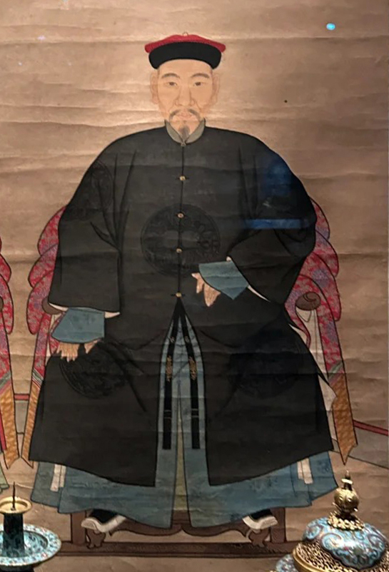 清代是中国传统绘画继续发展的时期,肖像画在民间有着广泛的需求。尤其是对于一些官宦世家、富裕家族来说,绘制家族长辈的肖像画,是纪念先辈、彰显家族荣耀以及传承家族文化的重要方式。这种肖像画注重人物神态和服饰细节的描绘,以写实的手法展现人物身份和地位。画中人物的服饰造型符合清代的服饰制度,从侧面反映了当时的社会风俗、等级观念以及人们的审美取向,是研究清代社会文化的重要图像资料。