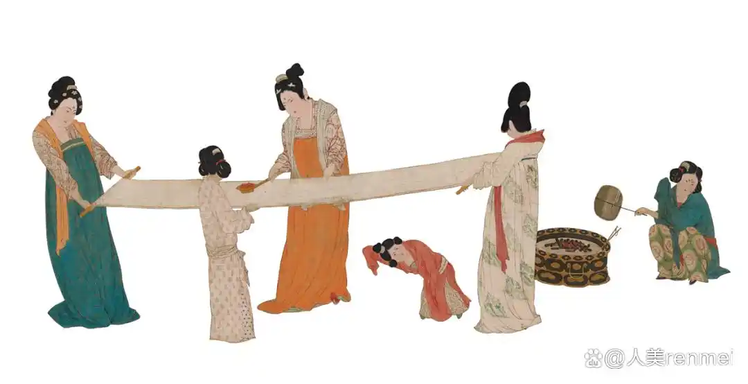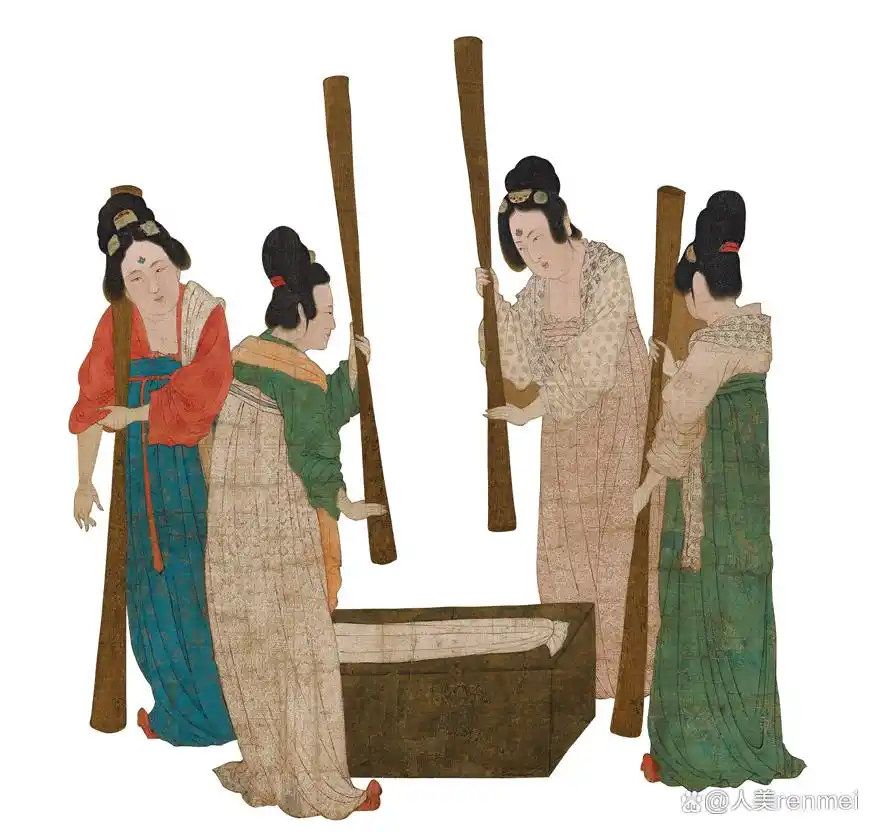 盛唐,长安是全国的丝织品生产中心,都城内有少府监、织染署、掖庭局等机构,下设官营丝绸作坊。玄宗后期,宫中专为杨贵妃造作锦秀金玉之工就达千人。官府作坊内也有为数不少的奴婢,一些技艺出众的被分配到掖庭局劳作,所得报酬仅为日常衣食。《捣练图》中所描绘的劳作景象,真实再现了她们的生活。