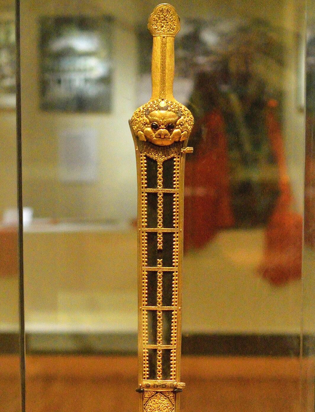 原为明成祖朱棣赠予西藏活佛的礼物,后于八国联军侵华期间被英国士兵夺走流失海外 。此剑造于1420年,剑身长103.5厘米,重1.3公斤,剑身中部设剑脊,剑鞘饰有交错纹案及浮雕花面。剑格铸有藏传佛教瑞兽“琼”,通身包裹金银并运用镂空雕刻、錾刻工艺 。剑柄为铁质鋄金工艺,柄首呈三叶形,正背面分别饰有三爪金龙及“琼”形象,侧面饰有佛教八宝图案。护手部分同样雕刻“琼”形象,头部装饰鋄金曜日及鋄银弯月。剑鞘为木胎皮革材质,外覆深色皮革并以铁质鋄金配件封边 。