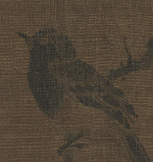 本品规格为24.3 x 21 厘米。画面以棕褐色绢本为底,营造出沉静的氛围。一只雀鸟栖息在枯瘦的枝桠上,雀鸟以简洁的水墨线条勾勒形态,羽毛的质感通过墨色的浓淡变化表现,神态灵动;枯树枝干用劲健的笔墨描绘,枝桠疏朗,与雀鸟相互映衬,整体画面简约空灵,尽显水墨写意的清逸之趣,传递出清幽孤寂的意境,展现了中国传统花鸟画注重意境与笔墨神韵的艺术特点。
