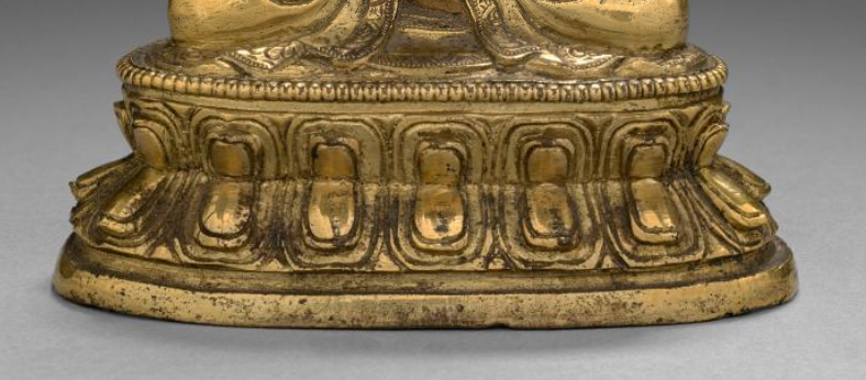 本品规格为9.9 厘米。以金属为胎体,表面鎏金,虽历经岁月,部分鎏金有磨损,但仍可见其华贵质感。佛像呈结跏趺坐之姿,身姿端庄稳重。头部螺发规整,肉髻高耸,面容安详平和,双目微阖,似在静思或慈悲观照众生。身着袈裟,衣纹流畅自然,褶皱处理细腻,贴合身形,尽显衣料的质感与垂坠感。双手结禅定印,掌心托着法器,姿态肃穆。佛像坐于莲花座上,莲座纹饰精美,层层莲瓣造型饱满,细节刻画入微,既体现出佛教艺术中莲花象征清净、神圣的寓意,也展现出明代造像工艺的精湛水准。