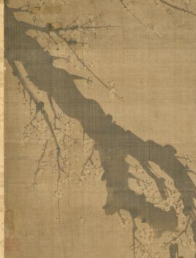 本品规格为127.2 x 66.8 厘米。画面以绢本为底,采用墨笔技法绘制梅花枝干。梅枝虬曲苍劲,或伸展、或盘绕,线条简洁而富有力度,尽显枝干的坚韧与古朴之态。枝头点缀着疏淡的梅花,墨色浓淡相宜,将梅花的清雅之姿悄然展现。背景色调素净,更衬托出梅枝的孤高与梅花的幽韵。整体构图疏朗空灵,笔墨简约却意境深远,体现了明代文人画注重以形写神、追求笔墨情趣与内在精神表达的艺术特点,传递出梅花傲雪凌霜的高洁品格,给人以沉静、雅致的审美感受。