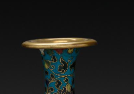本品规格为25.7厘米。以铜为胎体,采用掐丝珐琅工艺制成。瓶身造型优美,呈典型的玉壶春瓶样式,颈部修长,腹部圆润饱满,底部为圈足。瓶身主体以浓郁的蓝色珐琅为地,其上用金属丝精巧掐出缠枝花卉等纹饰轮廓,再填充红、黄、绿等多种色彩的珐琅釉料。各色珐琅相互映衬,花卉图案栩栩如生,色彩绚丽夺目且富有层次感。瓶口和瓶底边缘处装饰有金色,与主体的多彩珐琅形成鲜明对比,既增添了华贵之感,又起到了很好的装饰点缀作用。