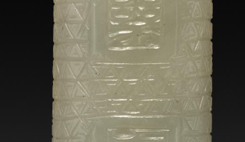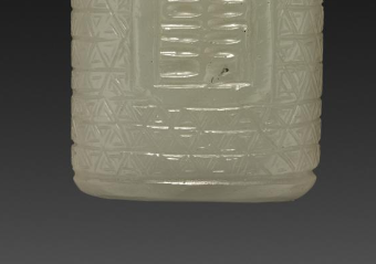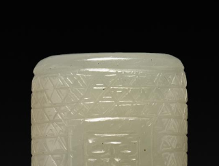 本品规格为4.2 厘米。以白玉为材质雕琢而成。整体呈圆柱形,造型规整简洁。玉质温润细腻,色泽洁白纯净,散发着柔和的光泽,尽显白玉的质感之美。勒子表面雕刻有文字,字体古朴,周围辅以几何纹样装饰,雕刻工艺精湛,线条流畅清晰,将文字与纹饰巧妙融合,既展现出文字的表意功能,又增添了器物的装饰性与艺术感。从工艺上看,其雕刻技法娴熟,细节处理到位,体现出清代玉器雕刻的高超水准,不仅是一件实用的佩饰,更是兼具文化内涵与艺术价值的玉器精品,反映出当时工匠的技艺水平以及对玉石文化的传承与发展,对于研究清代玉器工艺和文化具有一定意义。