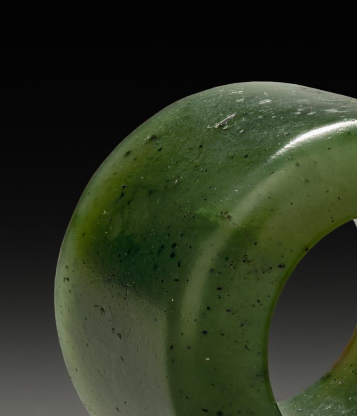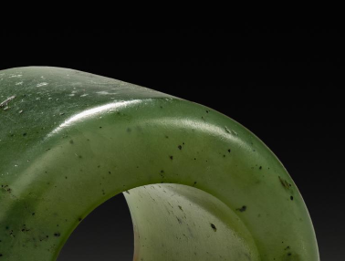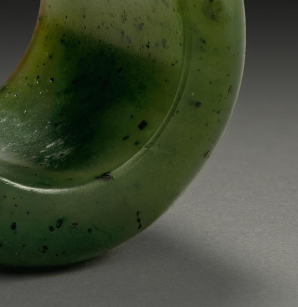 本品规格为直径3.5厘米,高度2.5厘米。以碧玉为材质雕琢而成。整体呈圆筒状,造型规整简洁。碧玉色泽浓郁,带有自然的墨点分布,质地温润细腻,表面光滑,散发着玉石特有的光泽,尽显碧玉的质感与韵味。扳指内壁打磨光滑,便于佩戴于手指;外壁线条流畅,无过多繁复装饰,却以玉石本身的材质之美和简洁的器型,展现出古朴典雅的气质。从工艺上看,其制作工艺精湛,对玉石的打磨、成型处理到位,体现出清代玉器制作的高超水准,不仅是一件实用的佩饰,更是兼具材质价值与艺术价值的玉器精品,反映出当时人们对玉石文化的喜爱与推崇,对于研究清代玉器工艺和佩饰文化具有一定意义。