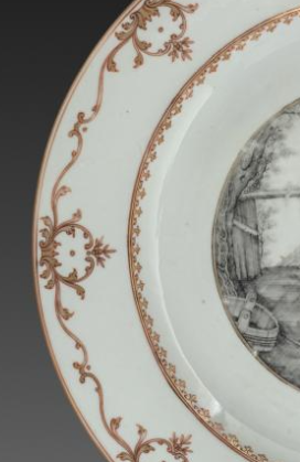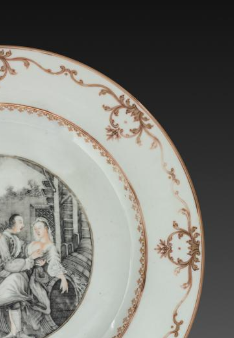 本品规格为36.3 厘米。瓷盘整体造型规整,胎质细腻。盘身以白色为底色,边缘饰有精美的描金花纹,花纹样式繁复且富有装饰性,线条流畅,金彩亮丽,尽显华贵。盘心绘制有西洋人物图案,画面呈现出西洋风格的场景,人物形象、服饰及周围的环境都带有浓郁的西方艺术特色,人物姿态生动,场景营造出一种别样的异域氛围。广彩工艺的运用,让色彩与金彩相互映衬,既保留了中国传统制瓷的精湛技艺,又融入了西洋元素,是清代中外文化交流在陶瓷艺术上的体现,具有较高的艺术与历史价值。