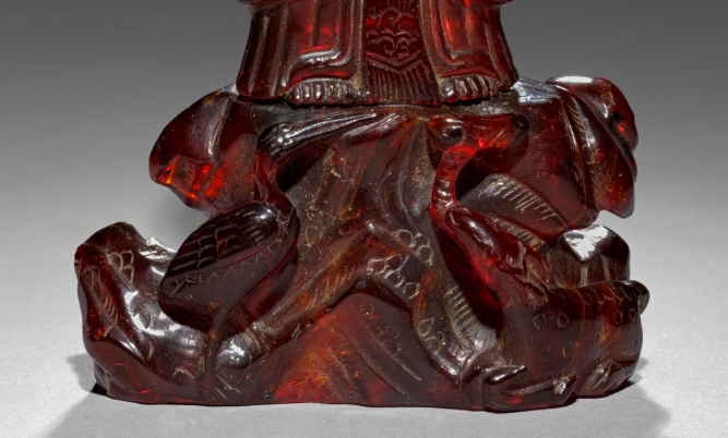 本品规格为16.9 厘米。观音像身姿端庄,面容慈祥柔和,头戴精致的冠饰,衣袍纹理雕刻细腻流畅,褶皱自然逼真,尽显飘逸之感。观音怀中抱着一个孩童,孩童姿态活泼,与观音的端庄形成呼应,传递出送子的美好寓意。像下的底座同样以琥珀雕刻,造型似祥云或山石,雕刻有细致的纹饰,与主体观音像浑然一体,既起到稳固支撑的作用,又增添了整体的艺术美感。整体而言,这件琥珀雕送子观音像工艺精湛,将琥珀的材质之美与雕刻艺术完美融合,不仅是一件宗教题材的艺术珍品,也体现出清代雕刻工艺的高超水准以及对 “送子” 这类美好愿景的生动表达。