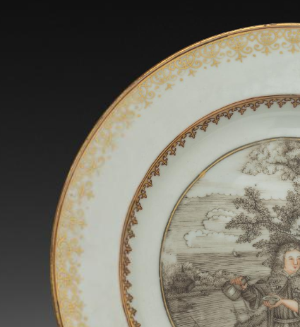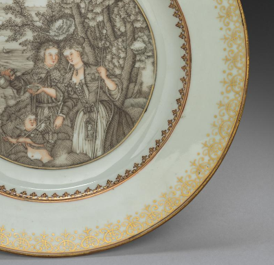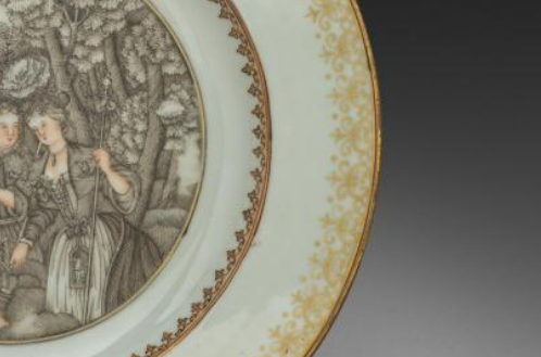本品规格为22.9厘米。瓷盘整体造型规整,胎质细腻。盘身以白色为底色,边缘饰有精致的描金花纹,花纹样式繁复且富有装饰性,金彩亮丽,尽显华贵。盘心绘制有西洋人物图案,画面呈现出西洋风格的场景,人物形象、服饰及周围的树木、景物都带有浓郁的西方艺术特色,人物姿态生动,场景营造出一种别样的异域氛围。墨彩的运用使得画面层次分明,与描金工艺相互映衬,既保留了中国传统制瓷的精湛技艺,又融入了西洋元素,是清代中外文化交流在陶瓷艺术上的生动体现,具有较高的艺术与历史价值。