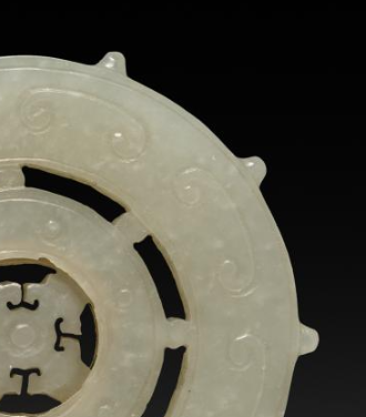 本品规格为5.6 厘米。以青玉为材质雕琢而成。整体呈圆形,造型模仿法轮的形态,设计精巧且富有层次感。外层轮缘带有凸起的齿状装饰,增添了器物的立体感与独特性;轮身雕刻有细腻的卷云纹等纹饰,线条流畅,工艺精湛,尽显清代玉器雕刻的高超技艺。