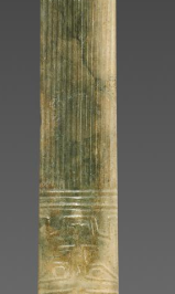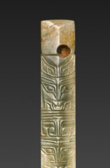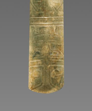 本品规格为18.6 x 1.8 厘米。整体呈修长的长条状,质地为玉,色泽温润。其表面雕刻有精美的兽面纹,纹饰线条规整、细腻,兽面形象神秘威严,带有商代艺术特有的庄重与神秘色彩。玉圭顶端有一孔,可能用于穿系等用途。它不仅是商代玉器工艺的体现,更是当时礼仪制度等方面的重要载体,具有较高的历史与艺术价值。