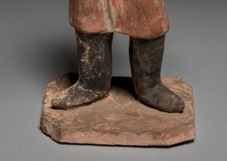 本品规格为21 x 8.3 厘米。俑为站立姿态,整体造型生动。人物头戴圆形帽子,面部五官刻画颇具异域特色,神情鲜活。身着带有彩绘的服饰,虽历经岁月,部分色彩有所斑驳,但仍能看出服饰的样式与色彩搭配,展现出唐代胡人服饰的特点。人物姿态独特,一只手臂抬起,似在进行某种动作,姿态富有动感与生活气息。俑的制作工艺精湛,通过塑造与彩绘,将唐代胡人形象鲜活呈现,是研究唐代中外文化交流、服饰艺术等方面的重要实物资料,具有较高的历史与艺术价值。