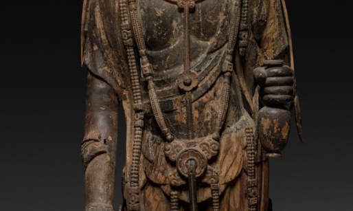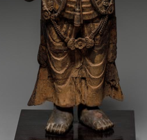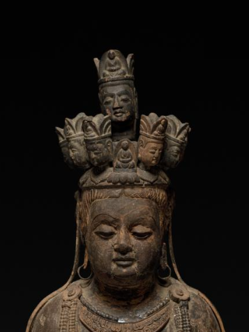 本品规格为62.9 厘米。观音像以木材为材质,整体造型庄严神圣。观音身躯挺拔,呈站立姿态,周身装饰繁复精美,佩戴有璎珞等饰物,衣纹雕刻细腻流畅,尽显飘逸之感。其头部有十一面,不同面像或庄严肃穆,或慈悲温婉,层次分明,展现出高超的雕刻技艺。整尊造像既体现了唐代木雕艺术的精湛水准,又蕴含着深厚的佛教文化内涵,是研究唐代佛教造像艺术与宗教文化的重要实物资料,具有极高的艺术与历史价值。