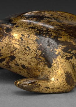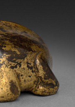 本品规格为5 厘米。整体呈蛙形,形态写实生动,蛙的躯体饱满,四肢自然趴卧, 眼睛圆鼓突出,精准捕捉到蛙类的形态特征,给人一种憨态可掬之感, 仿佛随时会跳跃活动,将蛙的生动神韵凝固于金属材质之上。采用鎏金工艺,虽历经岁月,部分鎏金有脱落,但仍可看出原本金辉闪耀的效果。 鎏金层与铜胎结合,在岁月侵蚀下形成独特的斑驳质感, 既展现出工艺的精湛,又因时间沉淀增添了古朴的韵味, 是研究魏代金属工艺与鎏金技术的重要实物。