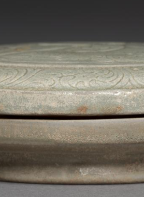 本品规格为直径13厘米,高度4.5厘米。以青釉为饰,釉色古朴,岁月沉淀使其更显厚重。整体呈圆形,盖面刻花工艺精湛,花纹流畅自然,似水波荡漾,尽显匠师技艺。盒身分层,造型规整,与盖面纹饰呼应,实用与美观兼具。此盖盒见证五代十国陶瓷风貌,是研究当时工艺、生活的珍贵实物,承载时代匠人的技艺与审美 。