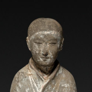 本品规格为54.9 厘米。为西汉陶制雕塑。以灰陶为材质,呈站立姿态,人物头戴小冠,身着长袍,衣纹简洁。双手拱手于身前,造型古朴写实,虽历经岁月,仍可窥见西汉陶俑塑造风格,是研究西汉丧葬文化、雕塑艺术及服饰风貌的实物,反映当时社会对丧葬明器的制作审美与工艺水平 。
