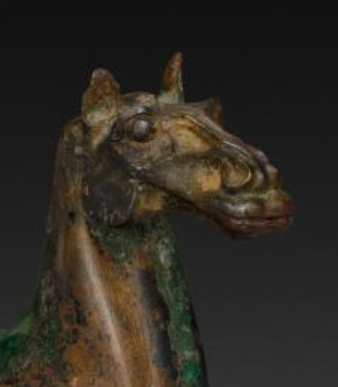 本品规格为6.5 厘米。马呈站立姿态,体态矫健,肌肉线条通过青铜铸造展现,马头昂起,双耳竖立,双目有神,生动呈现骏马的精气神,造型写实又具艺术张力。历经岁月,表面有斑驳绿锈,是时间沉淀的痕迹,增添古朴厚重感,也见证文物历史,不同锈色层次丰富,为其赋予独特沧桑美。