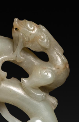 本品规格为6.4厘米。以温润的青白玉为材质。整体呈环形,造型精巧别致。环身之上雕刻有灵动的螭龙,螭龙形态矫健,身姿缠绕于环体,细节刻画细腻,龙首神态威严,龙身线条流畅自然,辅以卷曲的云纹等装饰,增添了灵动之感。玉石质地莹润,虽历经岁月,仍能感受到其细腻的质感与光泽,展现出南北朝时期玉器雕刻工艺的精湛,也体现出当时对螭龙等神兽形象的喜爱与推崇,是兼具艺术价值与文化内涵的玉器珍品。