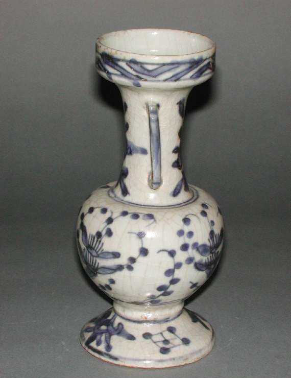 细节:口沿处装饰有简单的几何纹,颈部和腹部以青花描绘花卉图案,花卉形态生动,枝叶舒展,花朵或含苞或盛放,展现出自然的美感。双耳造型简约,与瓶身衔接自然。器物表面可见细微的磨损、小的磕痕以及开片现象,显示出其经历了长时间的流传。