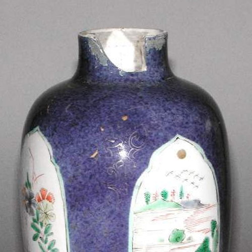 细节:罐体有多处开光,开光内分别绘有花卉和山水图案。花卉图中,花朵形态各异,枝叶舒展,色彩搭配和谐,展现出自然的生机与活力;山水图里,山峦起伏,树木葱郁,江水悠悠,画面富有层次感,仿佛能让人感受到大自然的宁静与壮美。紫地上还隐约可见一些金色的暗纹,虽历经岁月有些模糊,但仍能看出工艺的精细。器物表面有明显的破损痕迹,尤其是口沿和盖部,见证了其流传过程中的沧桑。