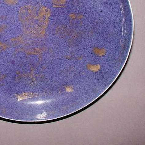 材质与色泽:以瓷土为胎体,质地细腻。盘内施霁蓝釉,色泽深沉,呈现出静谧而高贵的气质;盘外壁同样为霁蓝釉,底部圈足处施白釉。采用描金工艺,在蓝釉上描绘出金色的图案,虽历经岁月,部分金彩已有磨损脱落,但仍能看出当初装饰的华丽。