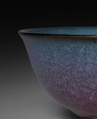 本品规格为直径17.8厘米,高度7.7厘米。整体造型为敞口、弧腹、圈足,器型规整大气。碗身以天蓝色釉为底,釉色温润似天空,质感莹润。在天蓝色的釉面上,自然晕染出大片的紫斑,紫斑色泽浓郁且分布富有自然意趣,与天蓝釉相互交融,形成了钧窑独特的窑变效果,宛如云霞漫布天际,变幻莫测,极具艺术感染力。