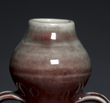 在清代,这类祭红釉绶带耳葫芦扁瓶主要作为陈设器使用。其独特的造型、艳丽的祭红釉色以及精美的绶带耳设计,使其具有极高的艺术观赏性,常被放置于宫廷、贵族府邸或文人书房等场所,用于装饰空间,彰显主人的审美品味与身份地位,是清代陶瓷艺术中兼具实用与艺术价值的代表性器物。