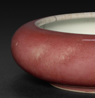 本品规格为直径8.6厘米,高度3.9厘米。整体呈圆形笔洗造型,器型圆润饱满,口沿较宽,腹部线条流畅自然,底部为圈足,造型规整,给人一种端庄秀丽的感觉。以瓷土为胎,施豇豆红釉。瓷胎细腻,豇豆红釉色泽如豇豆般,呈现出淡雅的粉红色,且釉面布满天然形成的斑点、晕散等变化,富有层次感与天然意趣,部分区域还带有绿色苔点,更显别致。