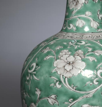 本品规格为27.3 厘米。此瓶为长颈瓶造型,颈部修长,腹部圆润饱满,底部为圈足,整体线条流畅优美。瓶身以绿色为地,采用墨彩绘制缠枝花卉纹,花卉形态各异,缠枝婉转灵动,纹饰线条细腻流畅,墨彩与绿地相互映衬,色彩搭配和谐雅致,给人一种清新且富有艺术感的视觉效果,釉面光滑莹润,尽显清代瓷器的工艺之美。