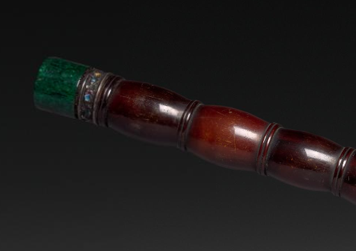 本品规格为59.8 厘米。烟杆主体为木质,呈现出深沉的红褐色,木质纹理清晰,质地温润,尽显木材的天然质感。烟锅部分为八棱形状,材质似银,表面带有岁月留下的氧化痕迹,增添了古朴的韵味。烟杆两端镶嵌有绿色的玉石或琉璃等材质的部件,与木质和银质部分相互映衬,色彩搭配和谐,提升了整体的精致感。烟杆整体修长,杆身呈竹节状,富有韵律感。八棱形的烟锅造型独特,与修长的木质烟杆搭配,既符合实用需求,又具有一定的装饰性,展现出简洁而不失精巧的工艺美感。