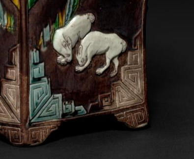 本品规格为16 x 26.8 厘米。该花盆呈菱形,造型别致。以素三彩(主要为黄、绿、紫等色)进行装饰,色彩搭配古朴典雅。器身堆塑有人物骑马以及动物(如白兔等)的纹饰,人物形象、动物姿态刻画生动,周围还辅以山石、回纹等装饰,工艺精湛,立体感强。底部有造型规整的足,支撑起整个花盆,整体设计富有艺术感与层次感。