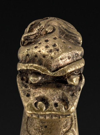 在清代,带钩主要用于束系腰带,起到固定和装饰腰带的作用。这件铜鎏金龙首 “寿” 字纹带钩,凭借其龙首造型与 “寿” 字纹,不仅具有实用的束带功能,还蕴含着吉祥寓意,彰显了佩戴者对长寿等美好愿景的追求,同时也能体现佩戴者的身份地位与审美品味,常用于服饰搭配中,为整体着装增添文化内涵与精致感。